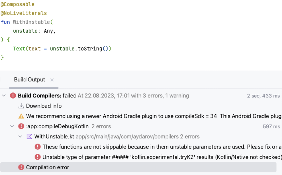 В докладе речь шла о реализации компиляторного плагина для проверки стабильности параметров функции для обнаружения таких @Composable функций, которые стали перезаупскаемыми, но не стали пропускаемыми. И там же я показал реализацию backend плагина, а в попытках сделать ошибку ближе к разработчику решил написать frontend плагин, так как были следующие причины: