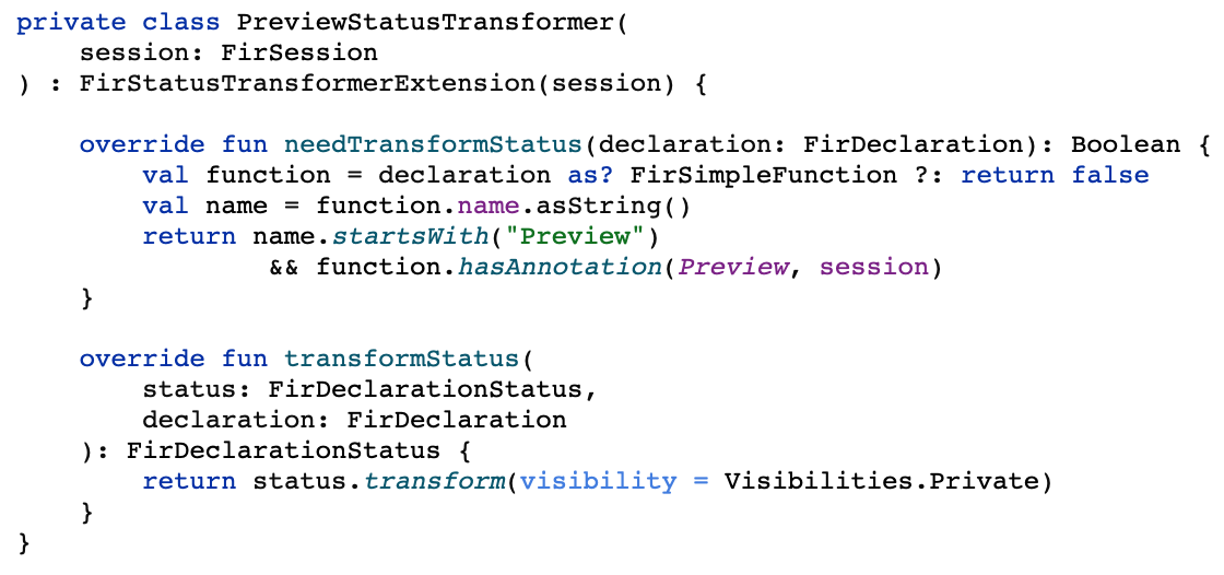 - Можно генерировать и изменять декларации. Без проблем поменять модификатор доступа переменной по какому-то правилу. Например, если у функции название начинается с Preview, и она содержит @Preview аннотацию, то можно сделать такую функцию приватной даже если этот модификатор не указан. Кроме того, сгенерированный модификатор потом уйдет на backend, в котором задача по изменениях модификатора доступа не такая простая, как может показаться.