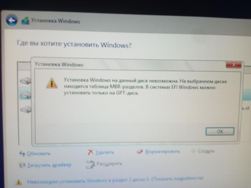 Невозможно установить windows в разделе 2 диска