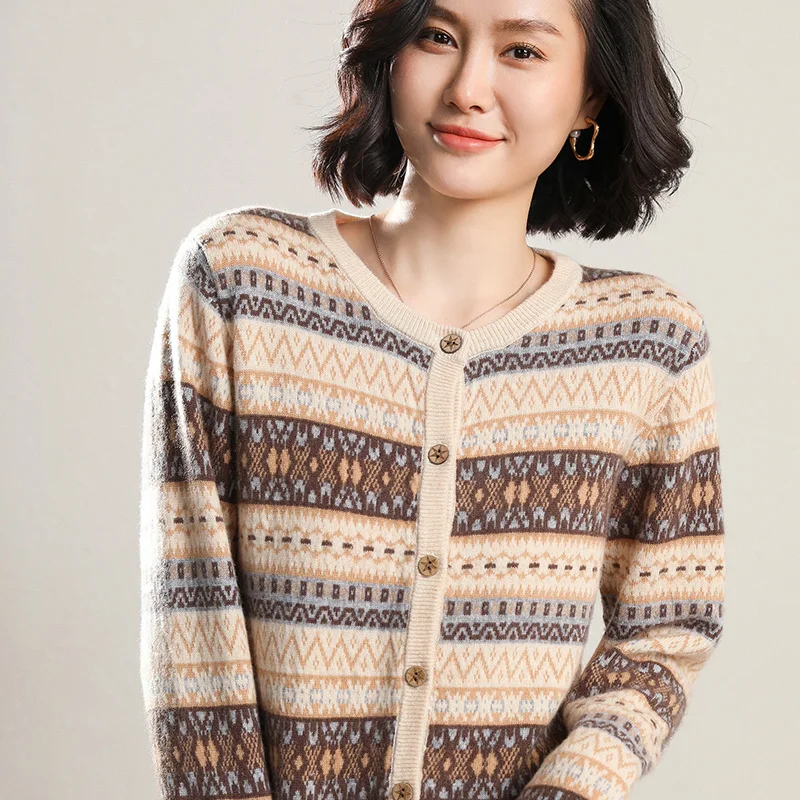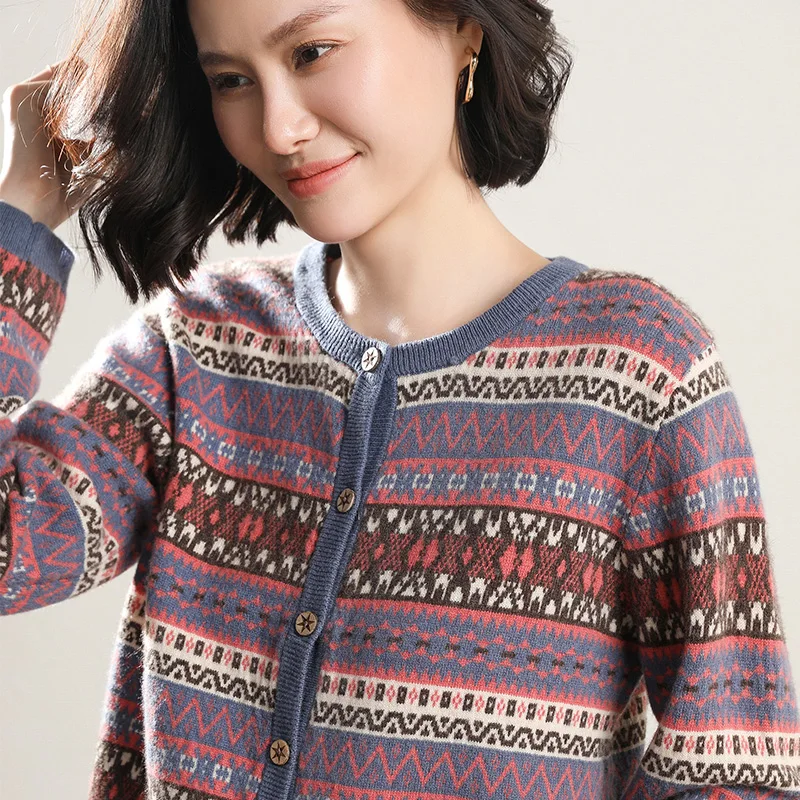 «New Autumn And Winter National Style Pure Wool Cardigan Women's Round Neck Short Striped Sweater Loose Knit Sweater» по лучшей цене на рынке! Всего за 51$ (4845рублей)