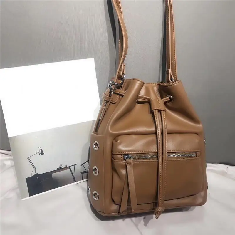 "New European And American Fashion Motorcycle Style Shoulder Bag Women's Rivet Drawstring Pocket Large Capacity Bucket Bag Women" * Buy Now With Free Shipping Just For $33