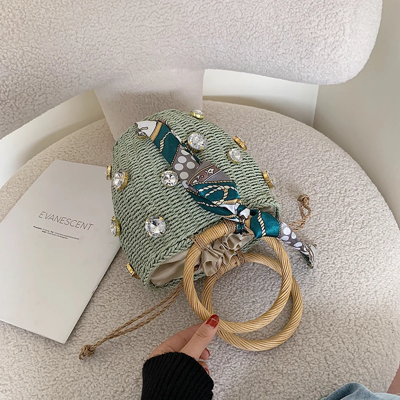"New Handmade Straw Rhinestone Crystal Embellished Small Straw Bucket Bag Ladies Travel Wallet and Handbag Brand Designer Handbag" * Buy Now Just For 17$