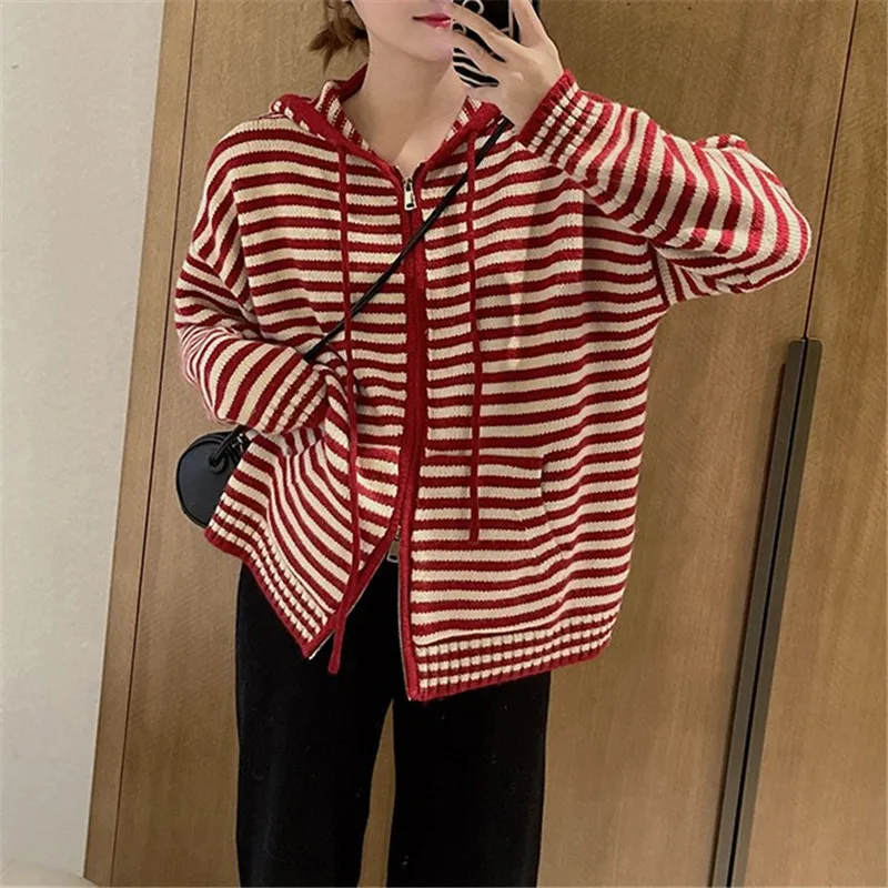 «New Patchwork Easy Matching New Long Sleeve Sweater Cardigan Mujer Autumn Spring Striped Hooded Zip Cardigan Soft Sweater» по лучшей цене на рынке! Всего за 22$ (2090рублей)