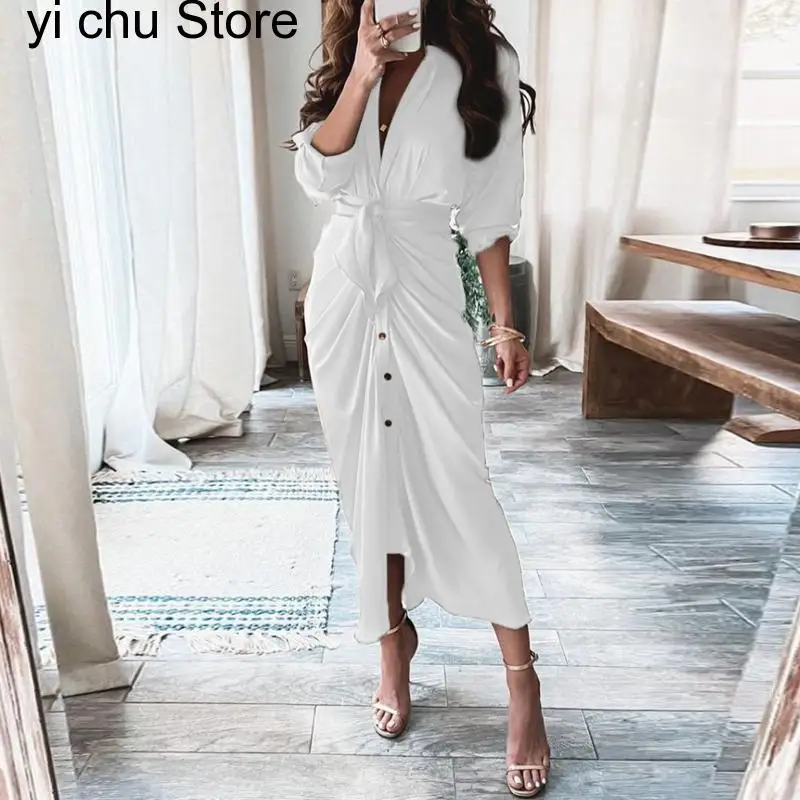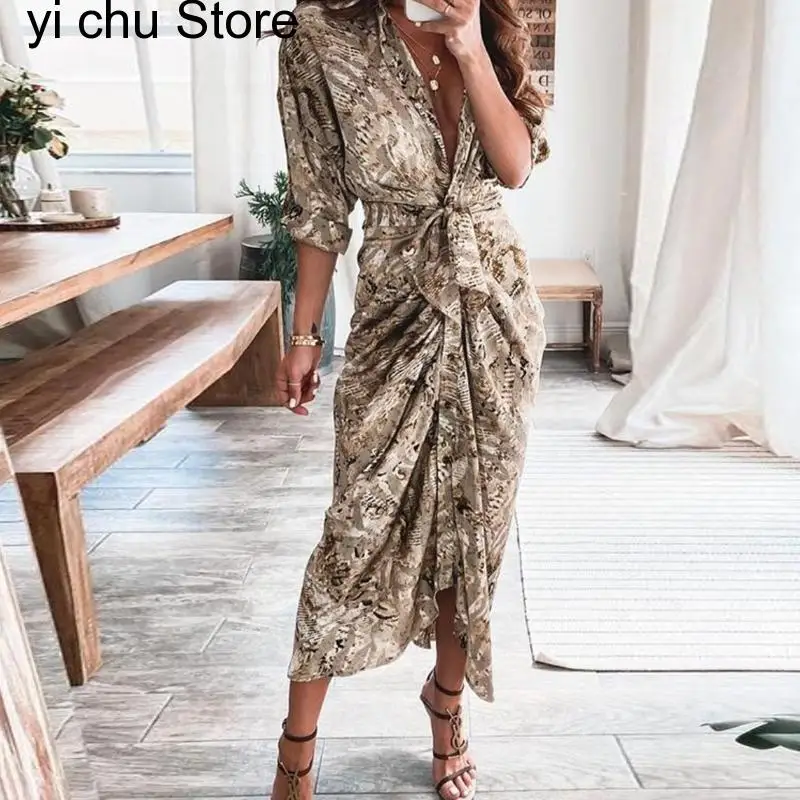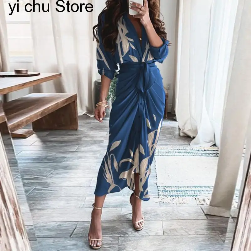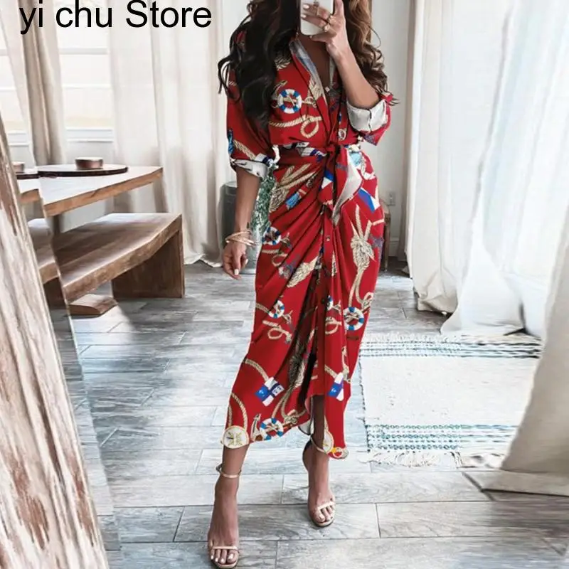 New Retro Pattern Print Split Boho Long Spring Turn-down Collar Single Breasted Party Dress Autumn Long Sleeve Maxi Dress Belt - Купить с бесплатной доставкой