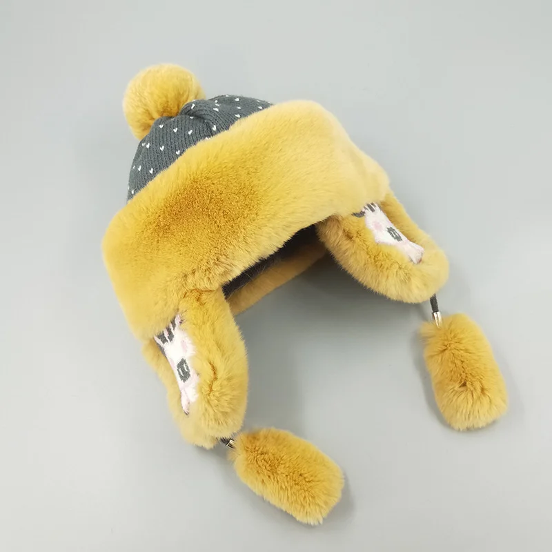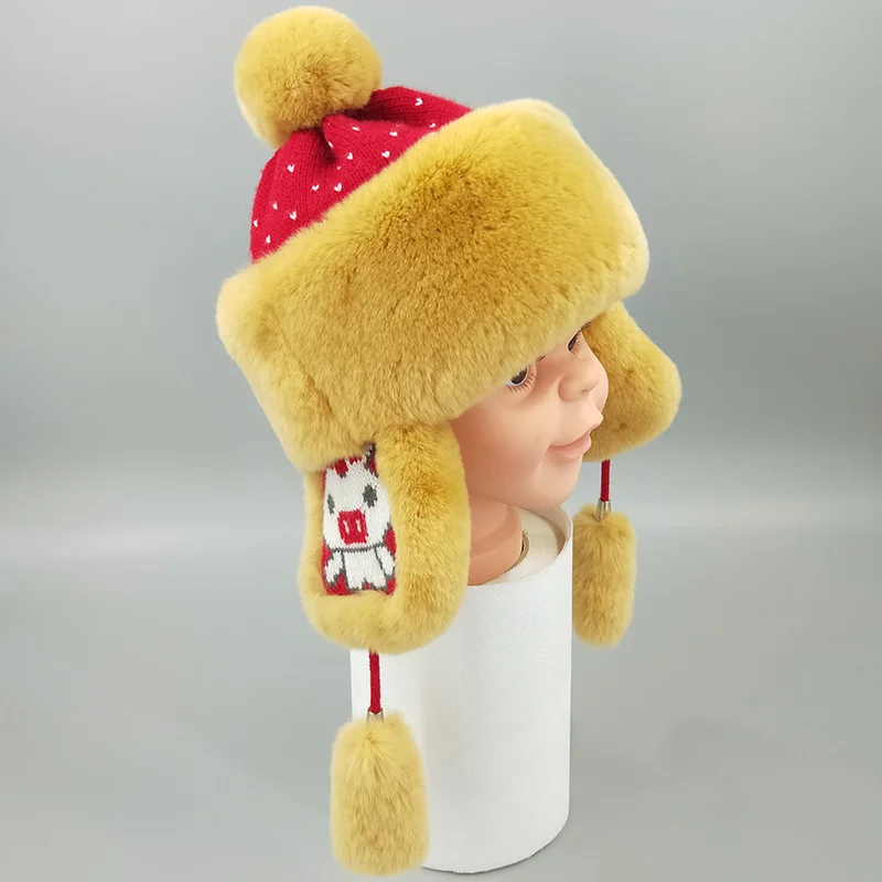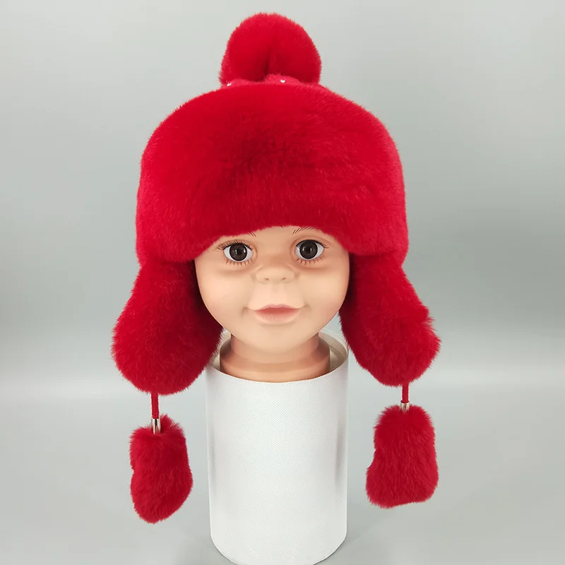 New Winter Cartoon Boys And Girls' Cap Rex Rabbit Fur Whole Leather Warm Ear Protection Wool Cap Wool Ball Solid Color - Купить с бесплатной доставкой