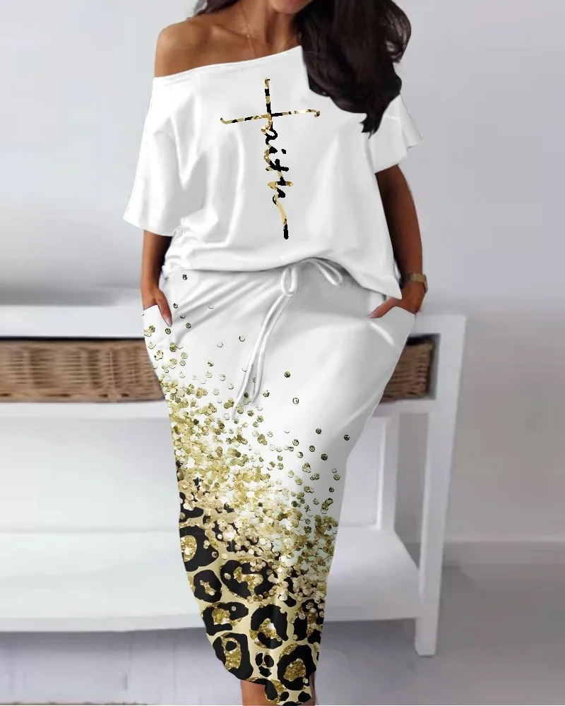 New Women's Leopard Pattern Tracksuits Neck Short Sleeve Top And Drawstring Skirts Two Piece Set Summer Outfits For Women - Купить с бесплатной доставкой