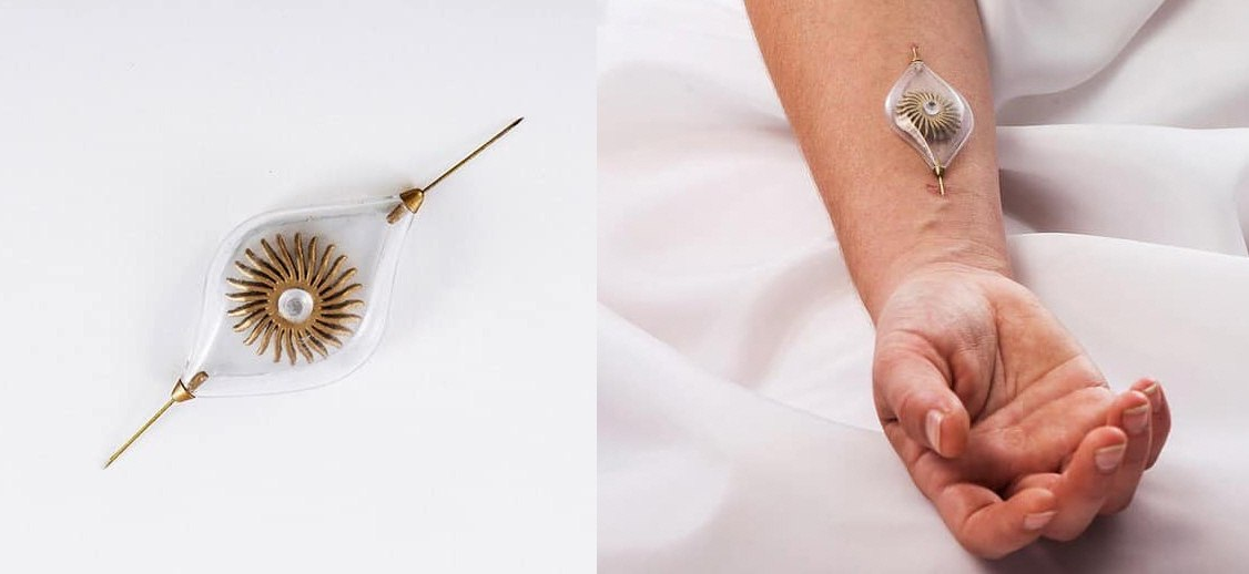 Одно из чудесных украшений дизайнера Naomi kizhner. Оно вставляется в вену и ток крови используется для вращения зубчатого колесика. Как мило