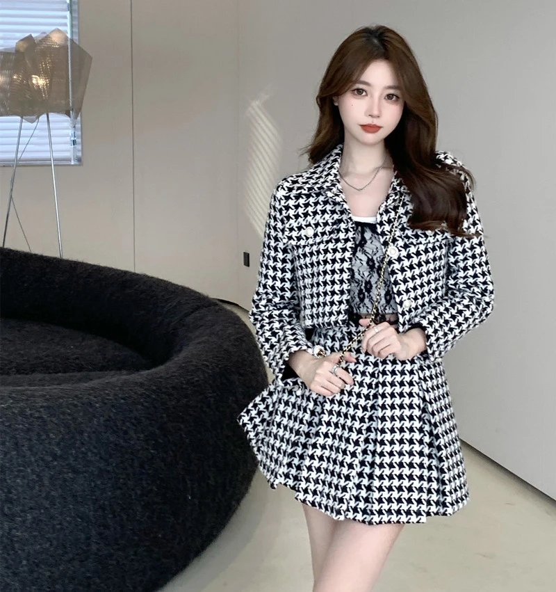 «New temperament matching sets retro o tweed plaid jacket short sleeve cardigan slim top mini houndstooth pleated skirt 2022» по лучшей цене на рынке! Всего за 49$ (4655рублей)
