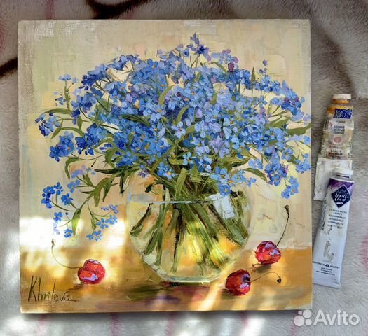 Картина маслом Незабудки в белой вазе . Масло, Холст . . .