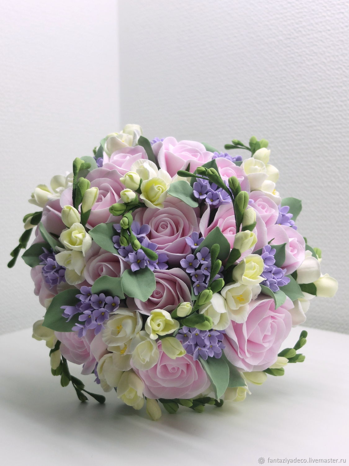 Букет невесты из розовых пионов и белых фрезий, декорированный белой атласной лентой : фото 1720533 на nevesta .info ekaterinalozko