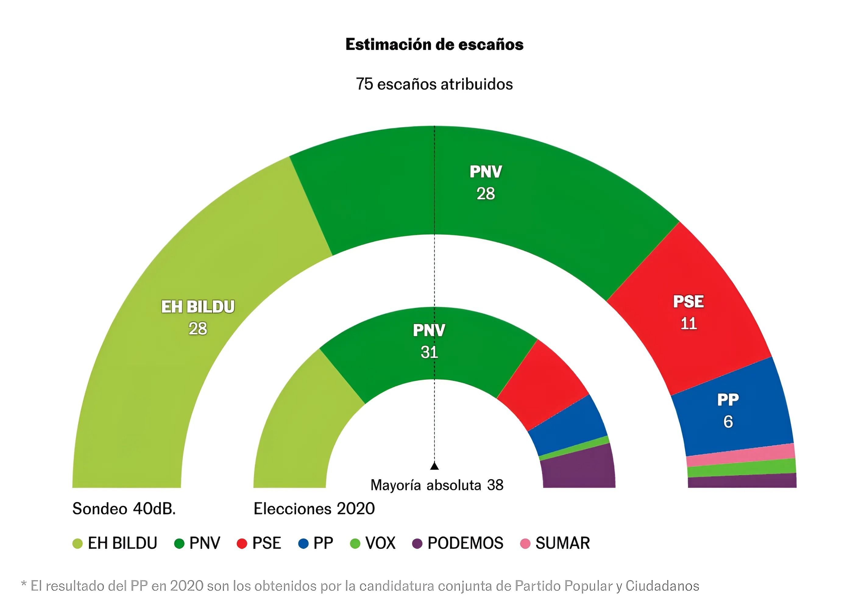 Исследование показывает, что между двумя националистическими партиями (обе могут набрать 28 мест) сложилась патовая ситуация с небольшим преимуществом в 0,5 п.п. для PNV. Социалисты располагают практически тем же результатом, что и четыре года назад, но на один мандат больше: это позволит коалиционному правительству получить 39 из 75 мест в парламенте.