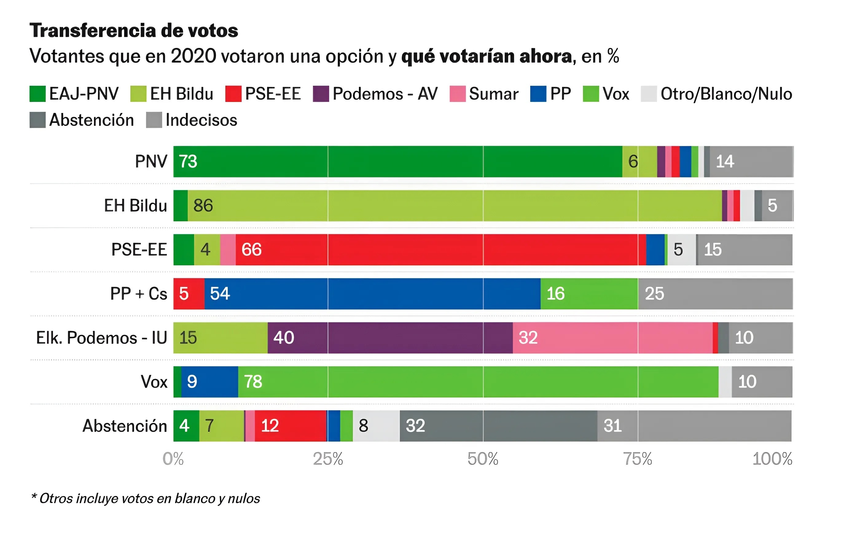 PNV, которая была правящей три срока подряд, за исключением 2009-2012 годов, теряет позиции. По сравнению с 2020 годом партия может потерять 4,5 очка и лишиться трех депутатов. EH Bildu, напротив, возлагает большие надежды: кажется, что она может набрать до 6 п.п., что принесёт семь дополнительных мест. Партия Арнальдо Отеги получит значительную часть бывших голосов Podemos (15 %), а также привлечет воздержавшихся и даже около 5% тех, кто в прошлый раз поддержал PNV и PSE.