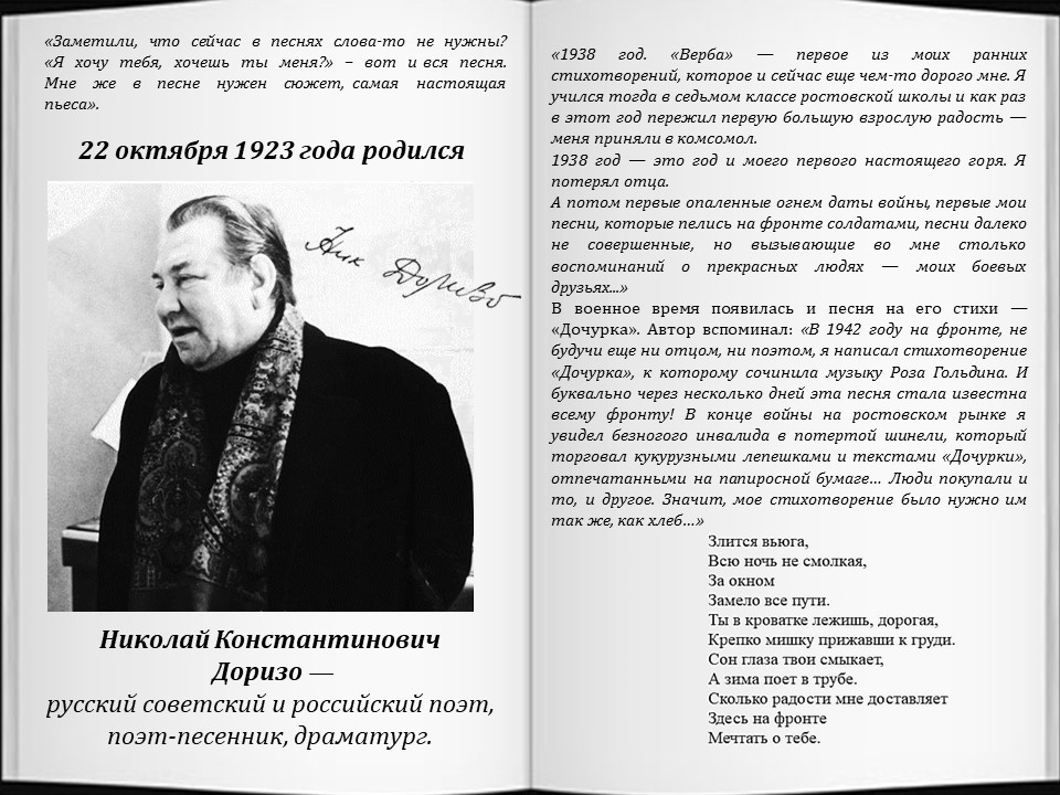 К 93-х летию Николая Доризо . (6 фото + 3 видео) Никола́й Константи́нович Доризо́ (22 октября 1923 — 31 января 2011) [1] — русский советский и российский поэт . Николай Константинович Доризо родился 22 . . .