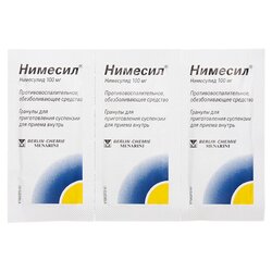 Нимесил (лат . Nimesil) — это гранулы, которые используют для того, чтобы приготовить суспензию для приема внутрь . Упаковывается в пакетики, содержащие по 2 г порошка каждый . Разводится средство в 250 мл воды, принимается по 100 мл 2 раза в день . Принимать нужно начиная с 12-летнего возраста, при весе не ниже 40 кг .