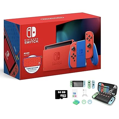 This Nintendo Switch system takes inspiration from Mario , with a bold red design on the Nintendo Switch Console, Joy-Con controllers, and the Nintendo Switch dock . A solid blue design is featured on both the Joy-Con grip and Joy-Con wrist straps . As a bonus, this Nintendo Switch bundle includes a Mario red & blue Edition carrying case adorned . . .