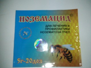 Крайне важно вовремя определить болезнь и принять меры по лечению пчелиной семьи . Основным действующим веществом ноземацида является нистатин . Порошковое вещество желтого цвета выпускается во флаконах дозировкой 5 г . Одного такого флакона хватает для использования 20 доз . Свойства: