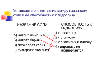 Задания на гидролиз солей . Среда водных растворов: кислая, нейтральная, щелочная . . .