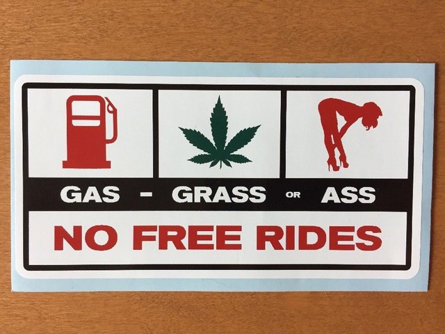 As far back as the 1970s, I recall hearing the phrase “Gas, Grass, or Ass — No one Rides for Free.” I’m not certain who first coined the phrase, or if in fact there was a historical author or ordering of the three items deemed acceptable as fare. At some point the words, presumably originating in the biker world, caught on and became a common saying appearing on t-shirts and bumper stickers world-wide.