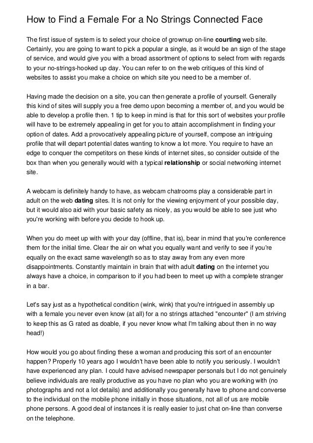 No String Attached is the leading reviews dating website . It specializes in discreet sexual encounters either in person or online . The dating website boasts itself strings 3 million members and more than 80, visitors strings month .