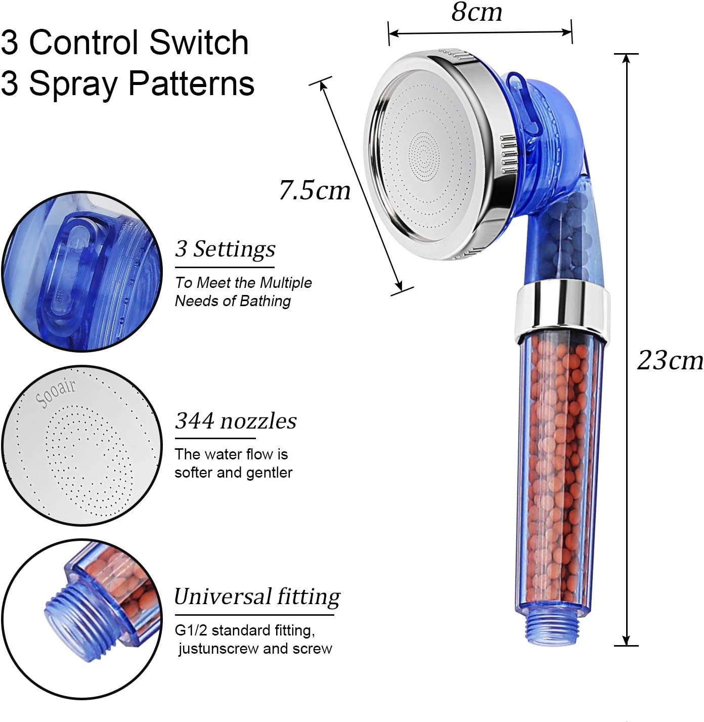 Fácil de instalar: Funciona con todas las roscas de tubo estándar de 1/2 ' . Se instala fácilmente en la pared de la ducha o en el brazo del techo en cuestión de minutos sin necesidad de un técnico . Filtro incorporado: flujo de agua suave Es perfecto para el baño en su casa u hotel .