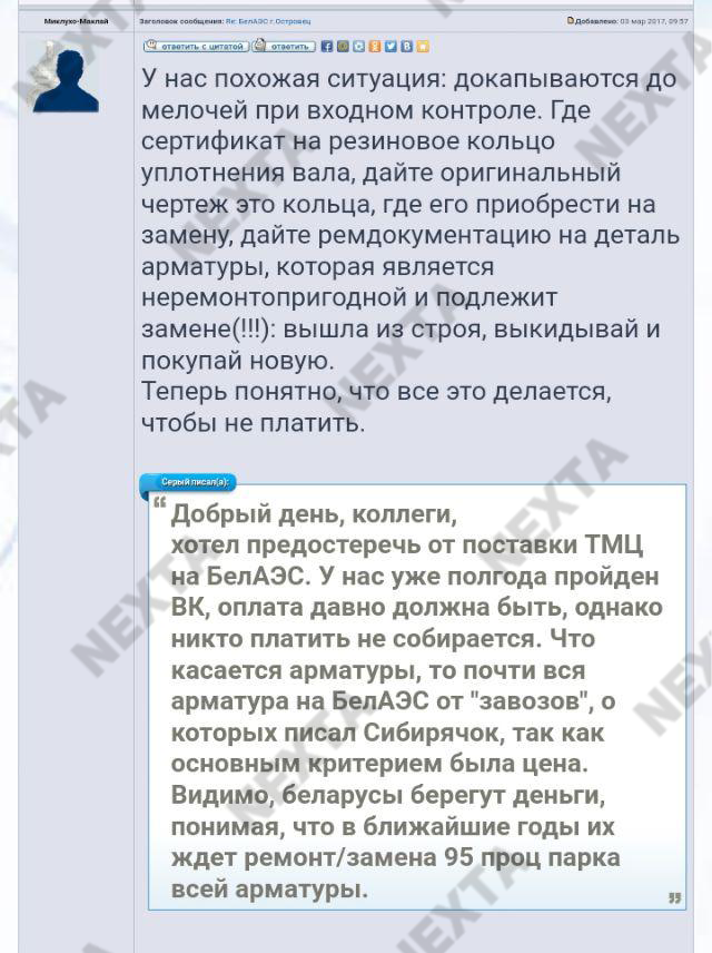 "Островецкая АЭС тупо не платит, а при формировании заявки интересует исключительно низкая цена и условия для получения товара без денег. Скупают в прямом смысле хлам, задвижки, фланцы, и в целом трубопроводную арматуру не проверяют. Насосы для воды точно им бракованные поставила одна питерская компания, причём они уже установлены... Деньги поставщикам из России не отдают, ссылаются на плохое качество продукции, но при этом заявки формируют таким образом, чтоб им предложили хлам. При этом, то что продукция непонятно откуда, оговаривается заранее, ведь нормальный продукт никто не отдаст по отсрочке платежа"