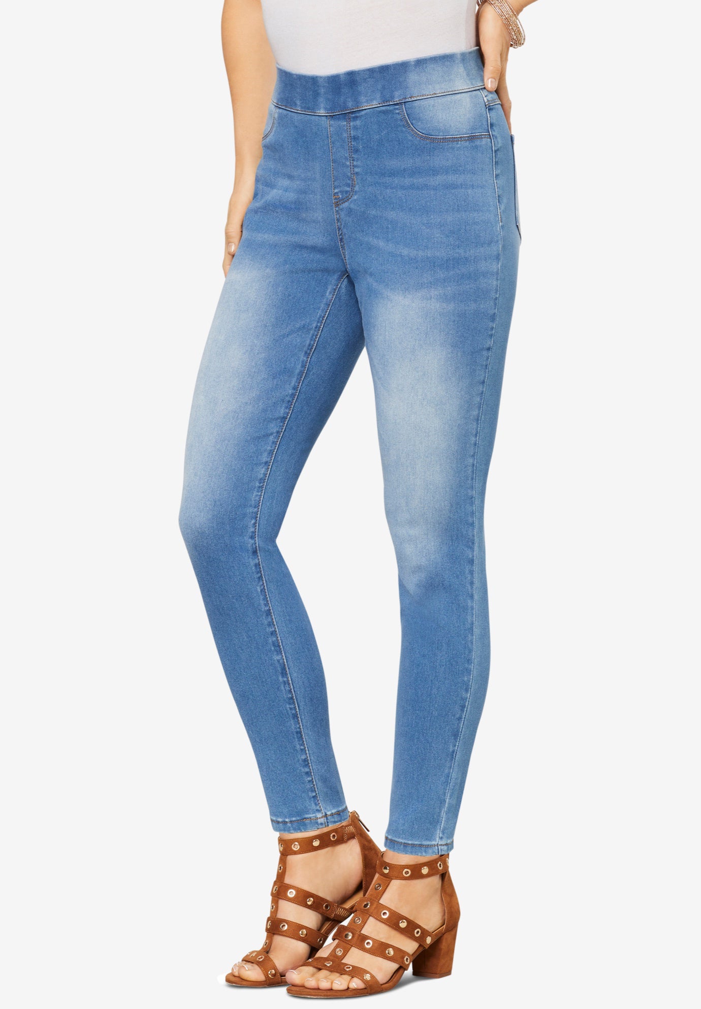 With the look of denim and the total comfort of leggings, these jeggings feature authentic jean styling with faux front pockets, faux fly, and real back pockets With gold topstitching on the pockets, side seam, and leg openings, you'll look great in these denim leggings, wearing them with confidence thanks to no-show coverage that hides panty lines