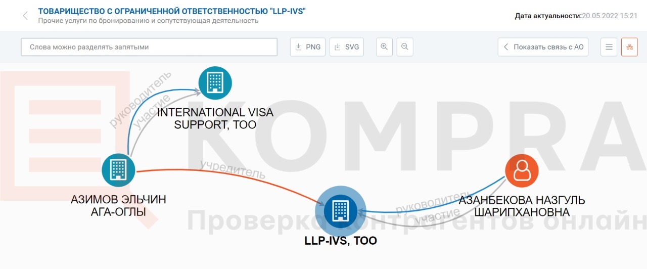 Учредителем ТОО «LLP-IVS», указанной в договоре с клиентом является Азимов Эльчин Ага-Оглы. Компания существует с декабря 2018 года. Также, нам стало известно, что с октября 2017 года по апрель 2021 года существовала еще одна компания ТОО «INTERNATIONAL VISA SUPPORT», руководителем которой был Азимов Эльчин Ага-Оглы.