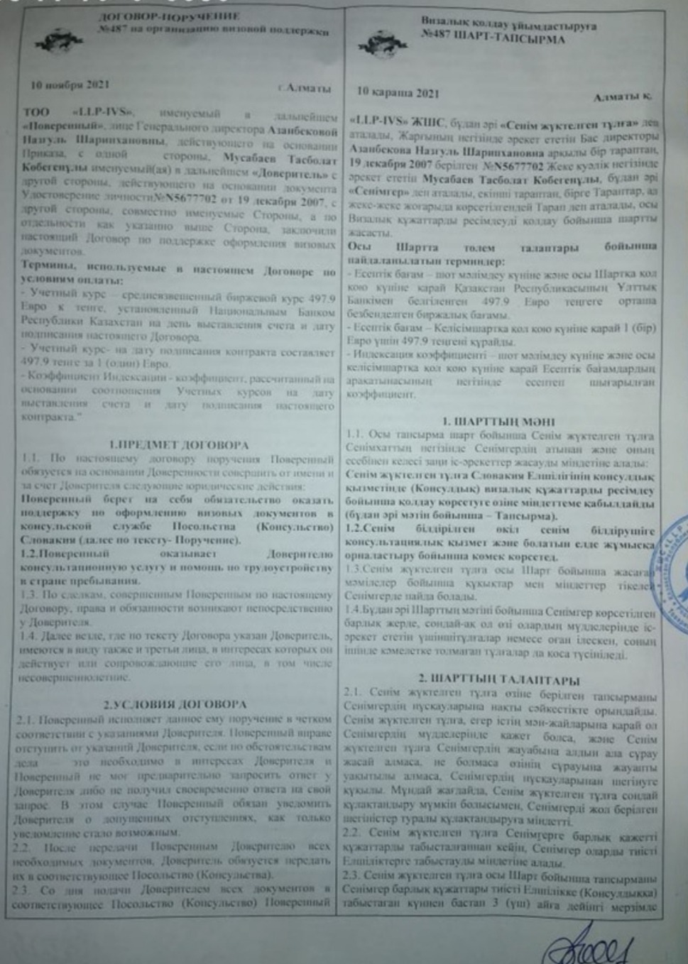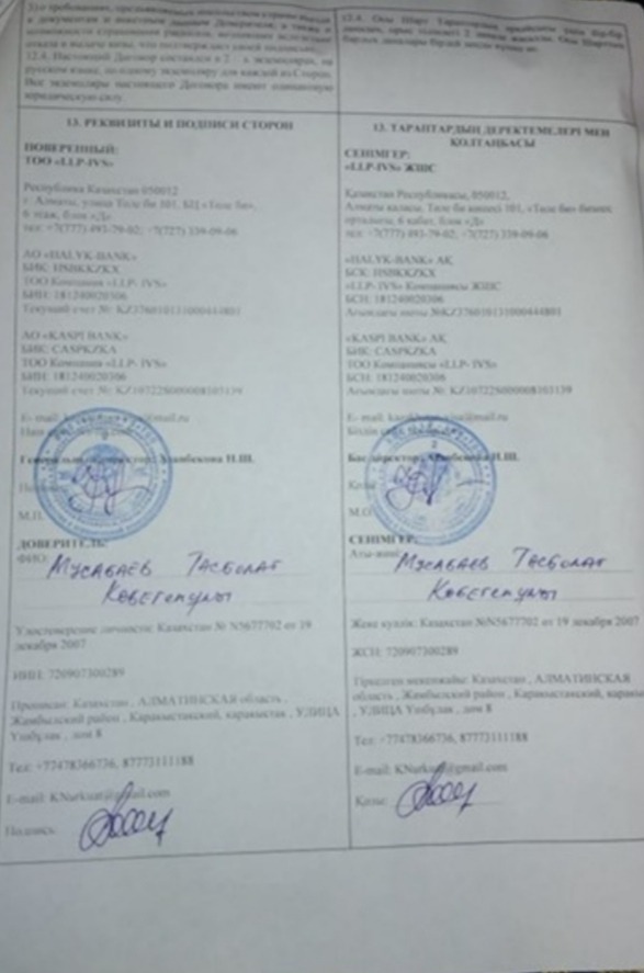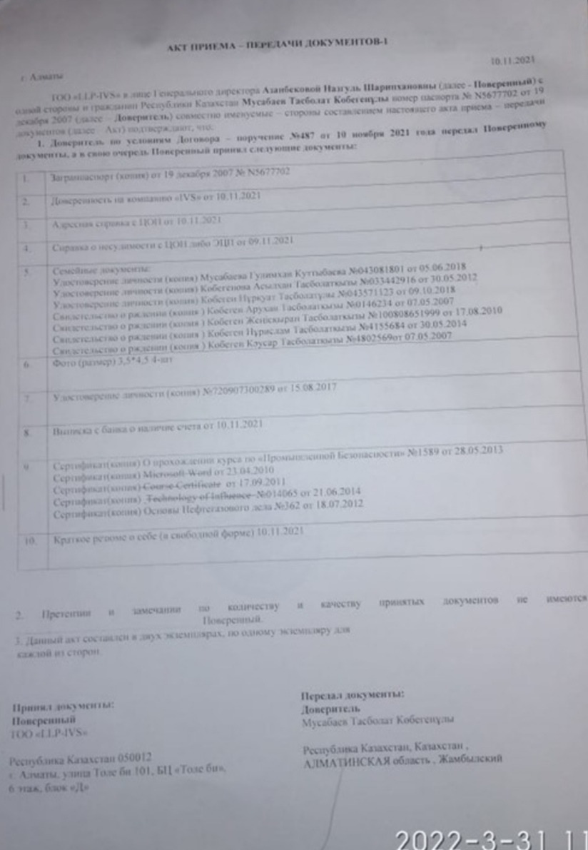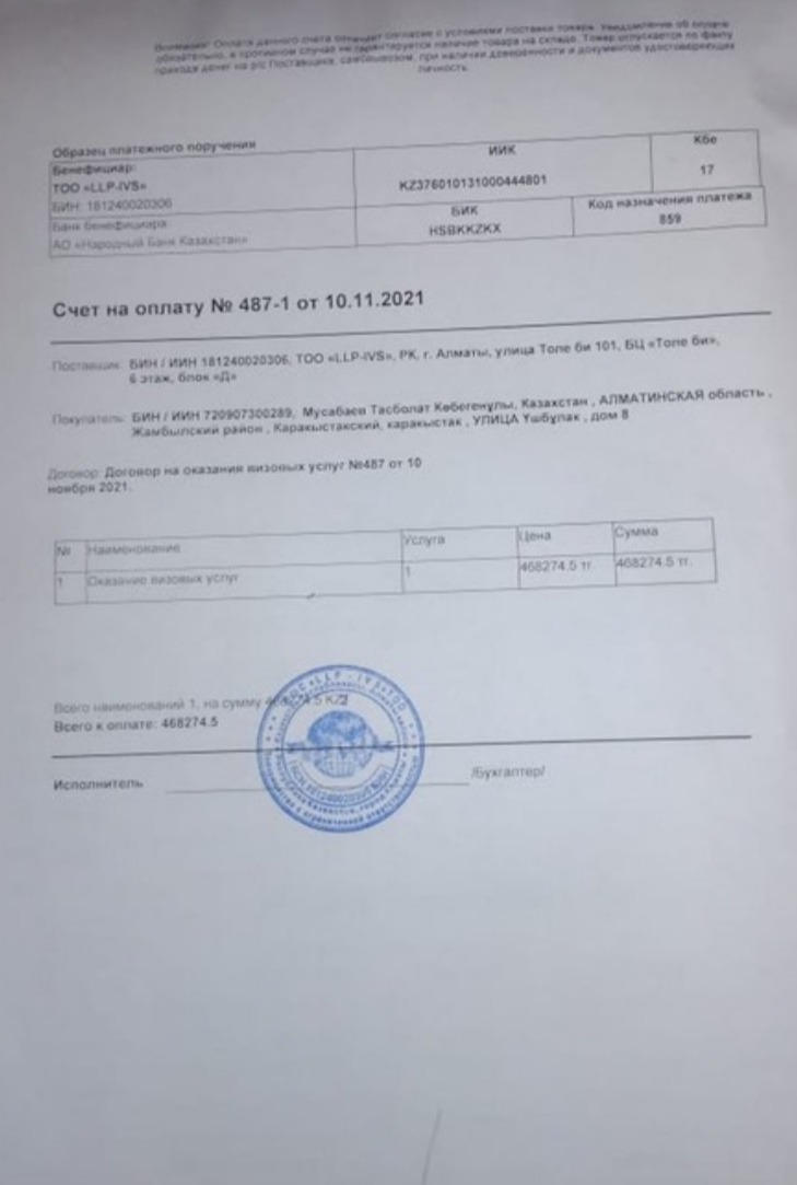 Так, в феврале 2021 года некий Орынбаев Д. А. заключил с ТОО «LLP-IVS» договор на организацию визовой поддержки, согласно которого компания обязалась оказать поддержку по оформлению визовых документов в консульстве Польша, а также обязалась помочь в трудоустройстве в странах Западной Европы и Скандинавии. Согласно договору, стоимость вознаграждения компании составляла около 1,3 млн тг, предоплата на момент подписания договора – 640 тыс тг. Позже между Орынбаевым и LLP-IVS было подписано допсоглашение о том, что компания берет на себя обязательство по оформлению шенгенской визы. В общем Орынбаев заплатил уже 960 тыс тг.