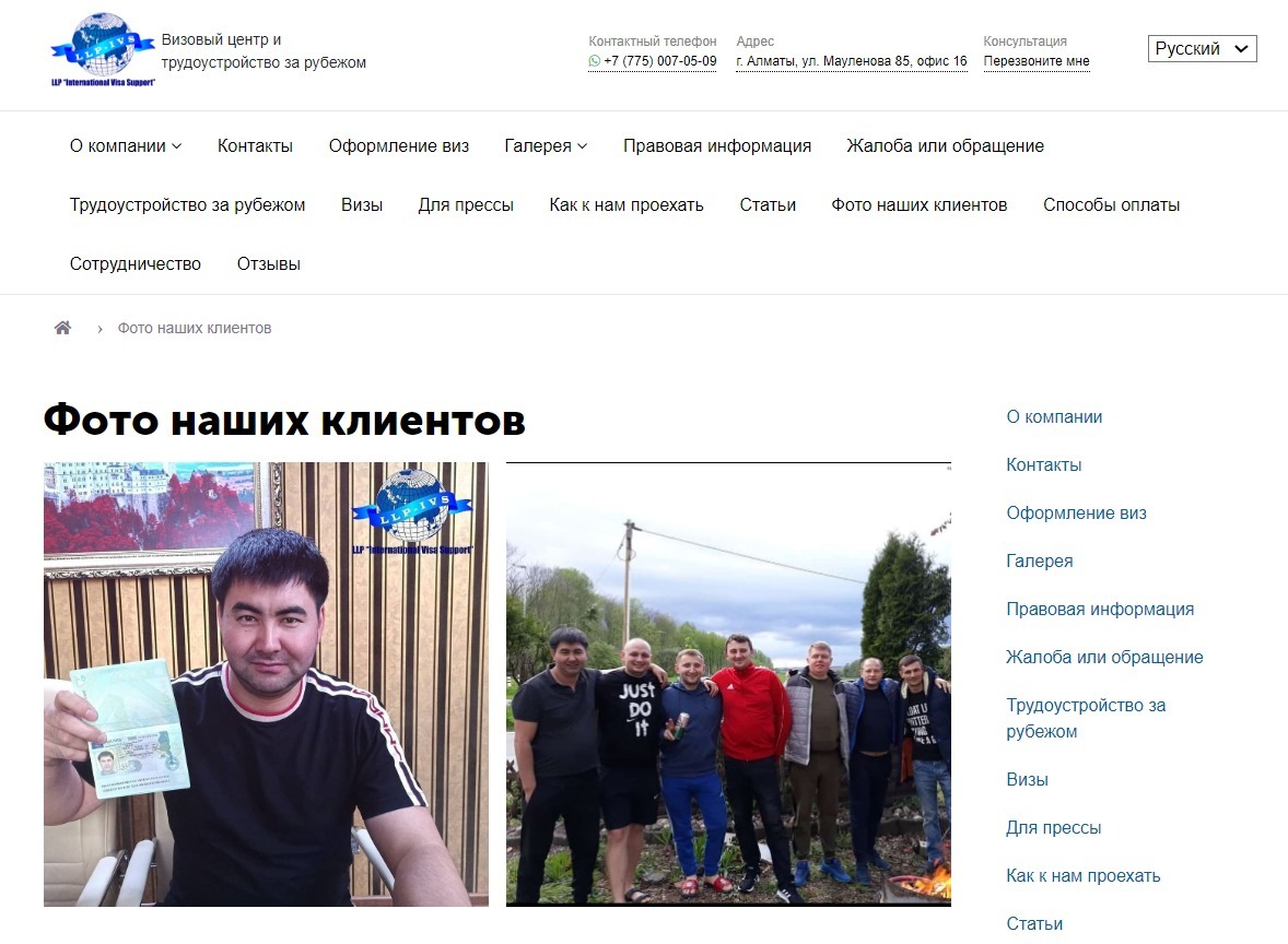 На другом сайте тоже есть медиа-отчеты: целых два фото клиента и большое количество фотографий выданных виз, где личные данные замазаны, а лица спрятаны смайликом.