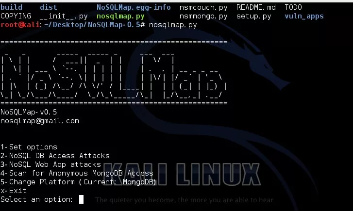 git clone https://github.com/tcstool/NoSQLMap.git cd NoSQLMap sudo python setup.py install NoSQLMap