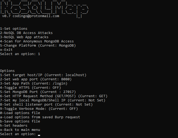 1. Set target host/IP-The target web server (i.e. www.google.com) or MongoDB server you want to attack. 2. Set web app port-TCP port for the web application if a web application is the target. 3. Set URI Path-The portion of the URI containing the page name and any parameters but NOT the host name (e.g. /app/acct.php?acctid=102). 4. Set HTTP Request Method (GET/POST)-Set the request method to a GET or POST; Presently only GET is implemented but working on implementing POST requests exported from Burp. 5. Set my local Mongo/Shell IP-Set this option if attacking a MongoDB instance directly to the IP of a target Mongo installation to clone victim databases to or open Meterpreter shells to. 6. Set shell listener port-If opening Meterpreter shells, specify the port. 7. Load options file-Load a previously saved set of settings for 1-6. 8. Load options from saved Burp request-Parse a request saved from Burp Suite and populate the web application options. 9. Save options file-Save settings 1-6 for future use. x. Back to main menu-Use this once the options are set to start your attacks.