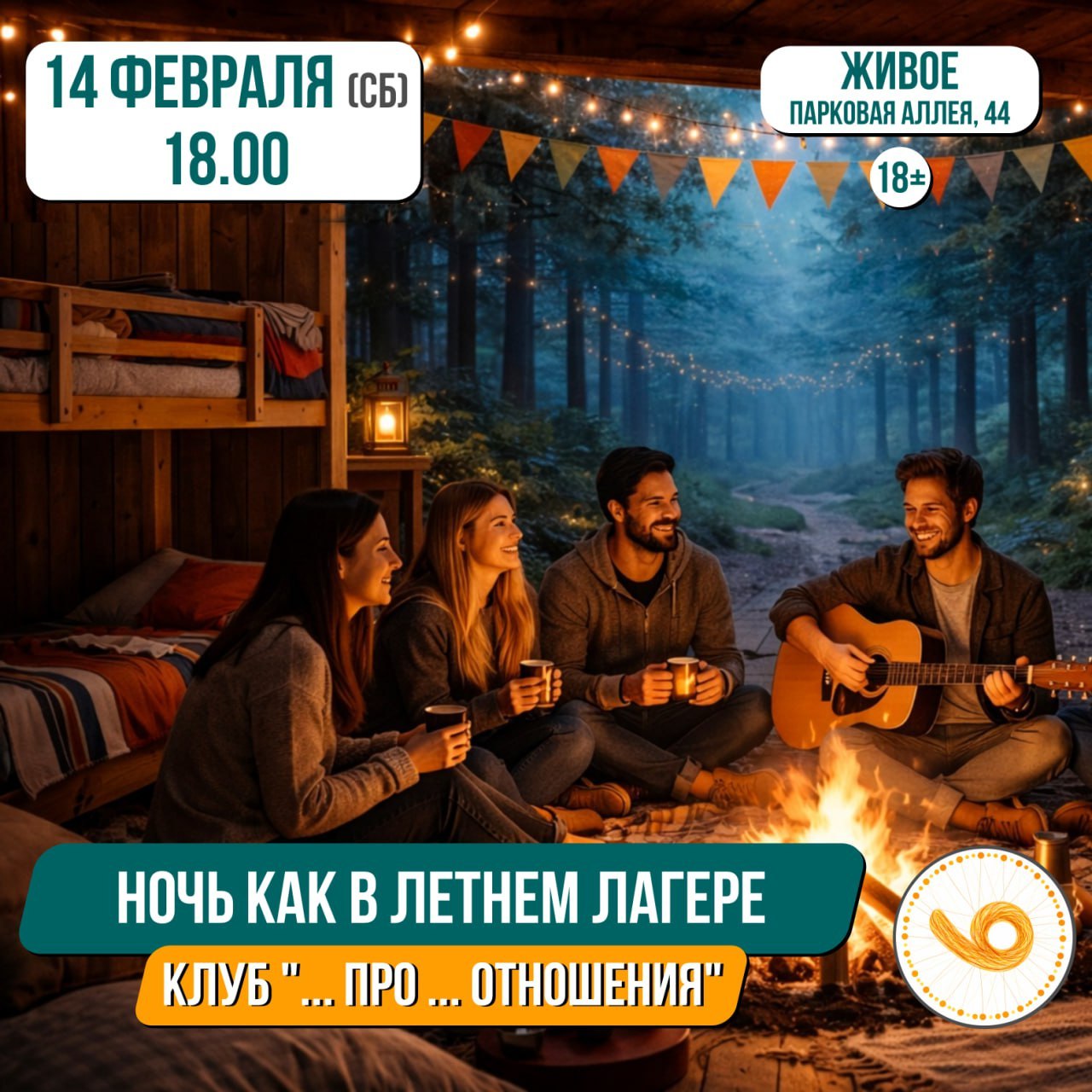 Вечер в стиле летнего лагеря с играми, песнями у костра и общением, строго 18+, обязательная регистрация через TimePad, скидки по промокоду для участников клуба.