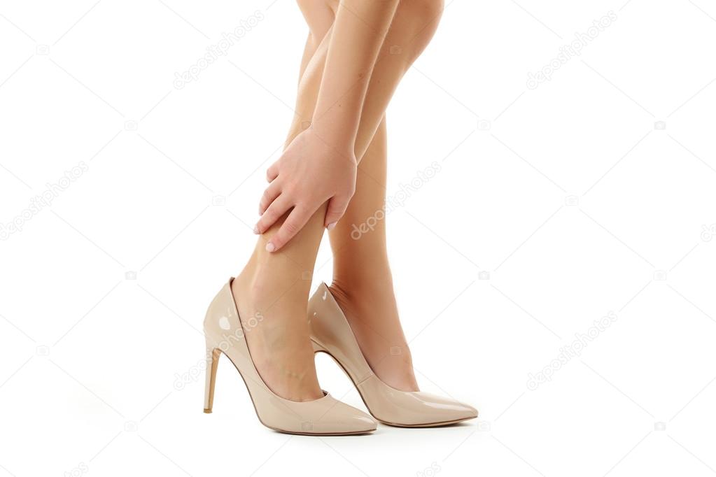 нога дразнят в кожаных леггинсах и высокие каблуки