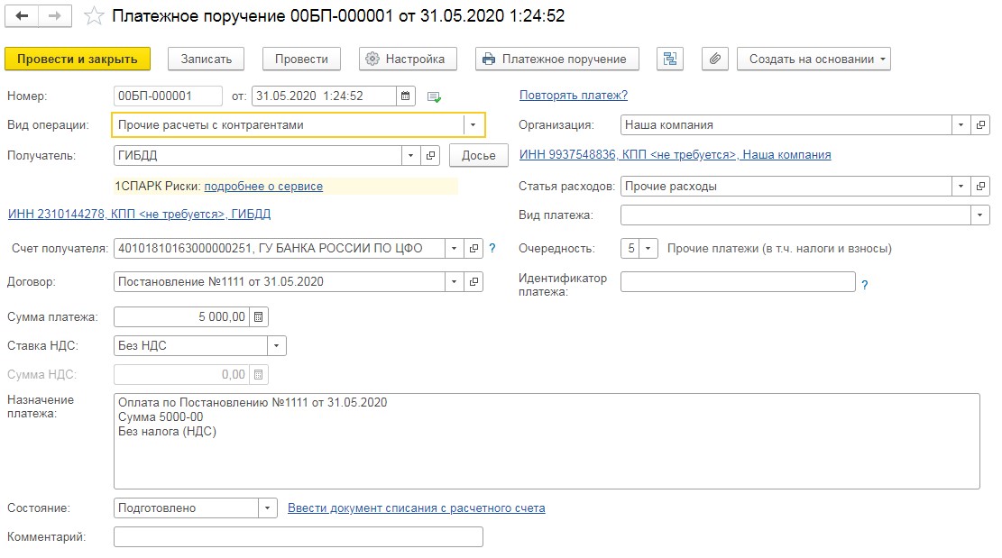 Номер счета штрафа