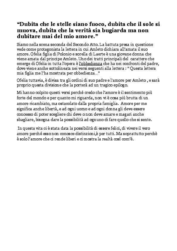 Dubita che le stelle sian di fuoco; dubita che si muova il sole; dubita che bugiarda sia la verità, ma non dubitar mai del mio amore . (William Shakespeare) Ti amo e ti amerò fino alla morte, e se c'è una vita dopo che, ti amerò allora . (Cassandra Claire) Perché, vedi, ogni giorno ti amo di più . Oggi più di ieri e meno di domani .