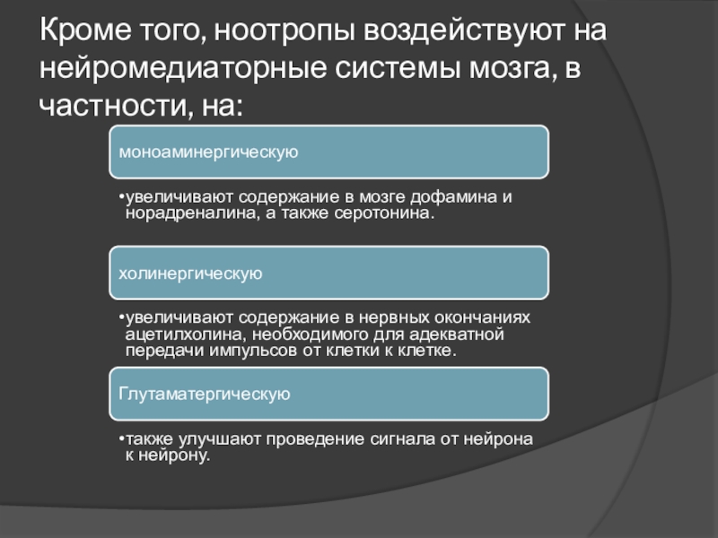 Дофамин усиливает когнитивные функции: память, внимание, обучаемость . . . . Именно поэтому студенты используют ноотропы, чтобы лучше сдавать экзамены . К сожалению, . . .