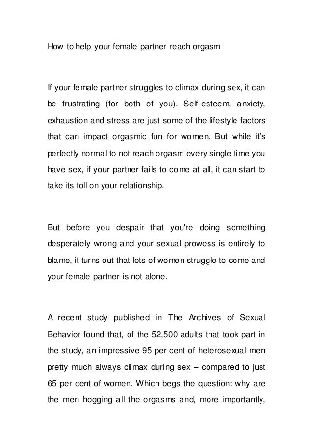 Likewise, on average, women said they reach orgasm 31-40% of the time in response to the question about intercourse in general . By contrast, women said they reached orgasm even more often with assisted intercourse (51-60% of the time), but less often with unassisted intercourse (21-30% of the time) .