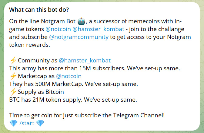 Notgram is a successor of memecoins with in-game tokens @notcoin @hamster_kombat, the fastest growing Telegram games, where you get coins by clicking/tapping. Notgram gives coin just for subscribe, it's called PROOF OF SUBSCRIBE, like Proof-of-work, proof-of-stake, proof-of-click cryptocurrencies.