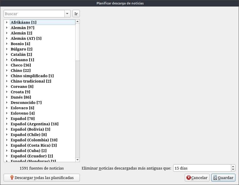 Elegimos el Idioma en la columna de la izquierda y se despliega las fuentes de noticias disponibles.