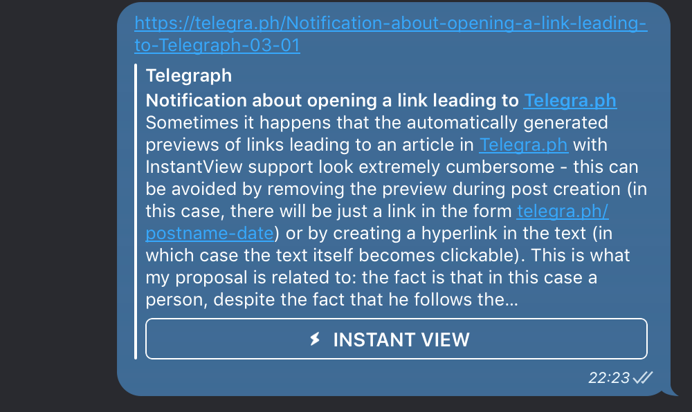 Bobby AxelrodSometimes it happens that the automatically generated previews of links leading to an article in Telegra.ph with InstantView support look extremely cumbersome - this can be avoided by removing the preview during post creation (in this case, there will be just a link in the form telegra.ph/postname-date) or by creating a hyperlink in the text (in which case the text itself becomes clickable). This is what my proposal is related to: the fact is that in this case a person, despite the fact that he follows the link to telegra.ph immediately before the transition, sees a notification with the choice "to open the link or not." I suggest removing this step for links to telegra.ph