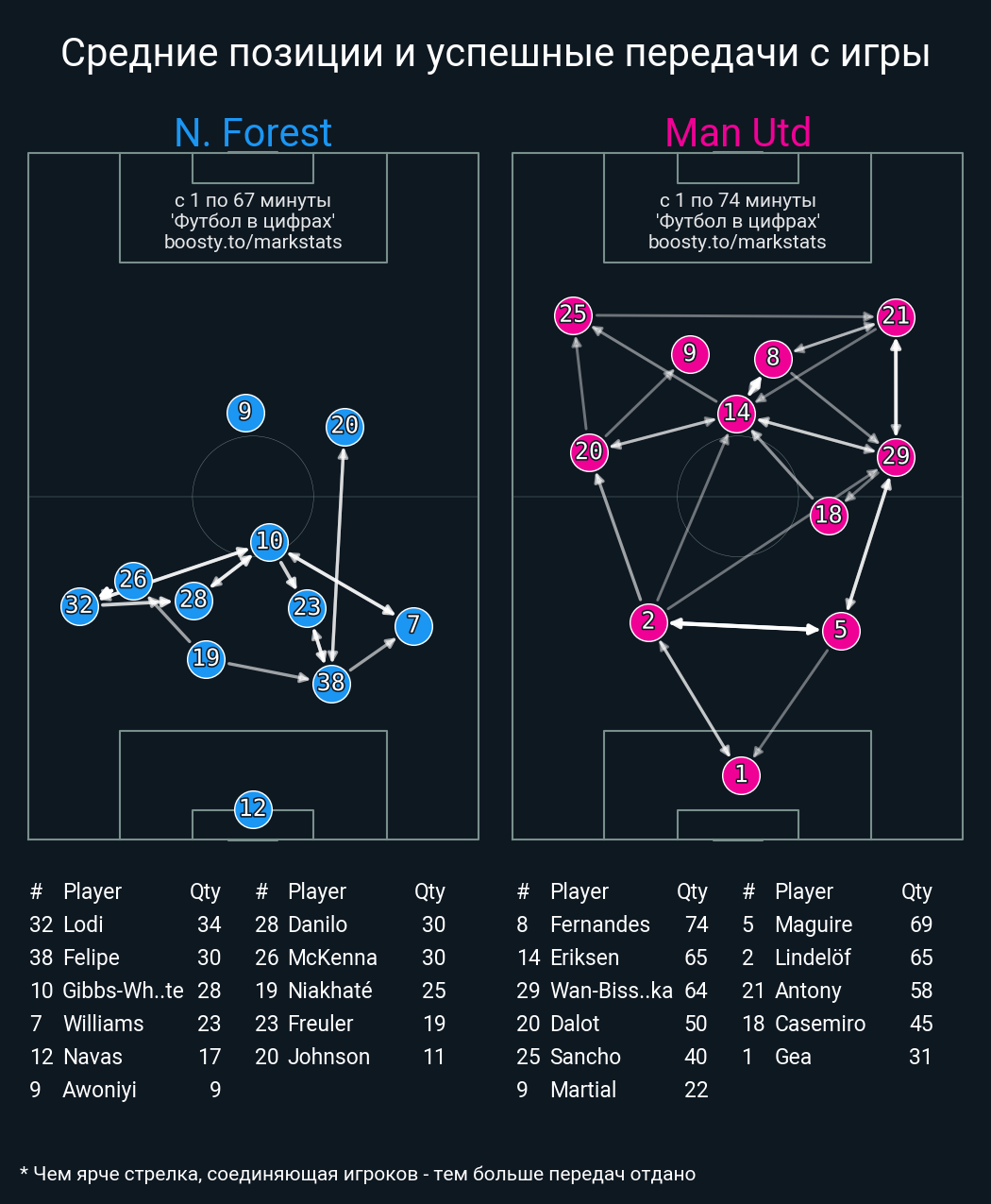 69 успешных передач из 77 попыток (1 под удар, 3 с продвижением, 20 на трети соперника)