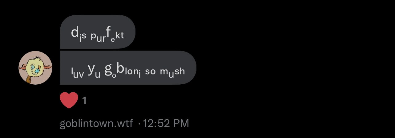 Да, Goblintown.wtf — это не про красивый арт и не про ютилити, а лишь про коммьюнити, иными словами, про бытие гоблином. А в чем плюсы этого, помимо возможности поставить NFT на аватарку в твиттере, получить пару ретвитов от аккаунта коллекции и, соответственно, новых подписчиков, — возможность быть причастным к определенной группе людей, по сути, к небольшой субкультуре, ведь у гоблинов есть даже свой уникальный «язык общения» в виде шрифта, которым они пишут.