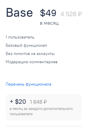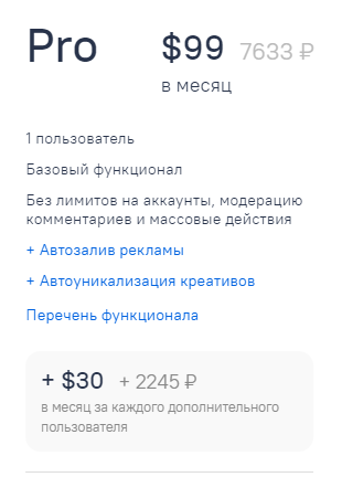 Тариф Про - 99$/мес + 30$/мес за доп пользователя, весь функционал сервиса без лимитов на всё, автозалив рекламы.