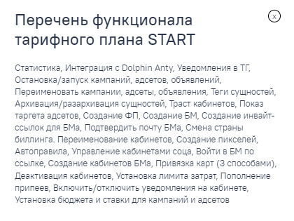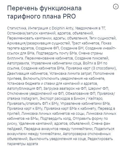 Тарифный план для настоящих профессионалов работы с ФБ и крупных команд. Содержит в себе максимум функций, которые доступны в сервисе и есть доступ к автозаливу и автоуникализатору креативов. Кроме наличия функций, для пользователей тарифа PRO есть доступ в закрытый чат, в котором можно пообщаться с ребятами из команд и обменяться опытом. Доступ появляется после оплаты тарифного плана.
