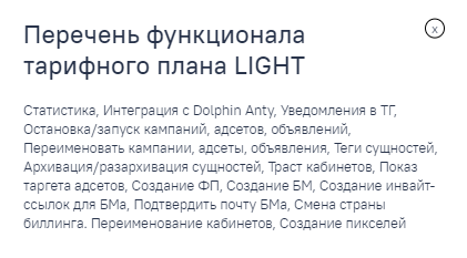 Тарифный план для опытых пользователей-рекламодателей ФБ и крупных команд, которые заливают рекламу вручную. Содержит в себе чуть меньше функций, которые доступны в сервисе и нет доступа к автозаливу. Массовые действия - основа тарифного плана.