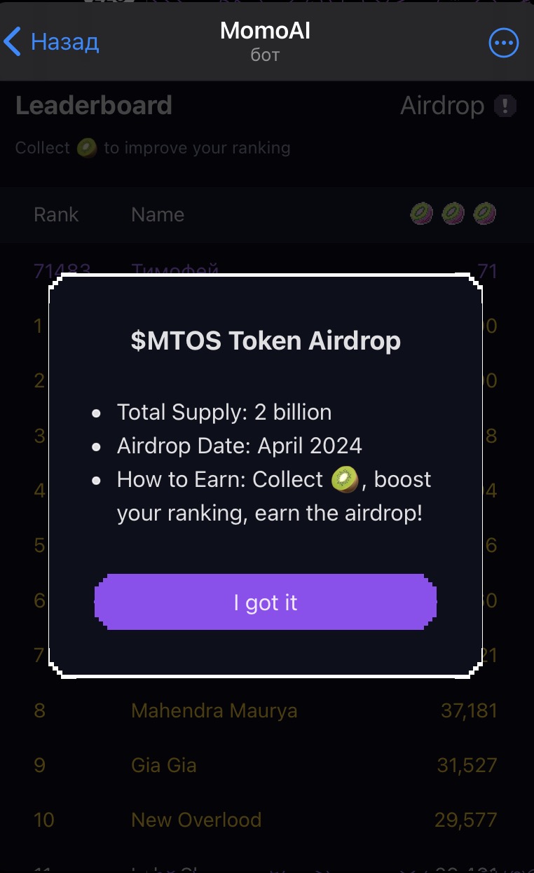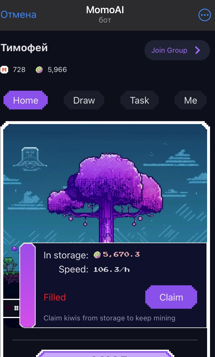 Wolf CryptoБуквально пару дней назад запустился бот MOMO в тг. В котором мы будем добывать киви. Проект очень похож на хот, но с меньшей поддержкой и на солане.
