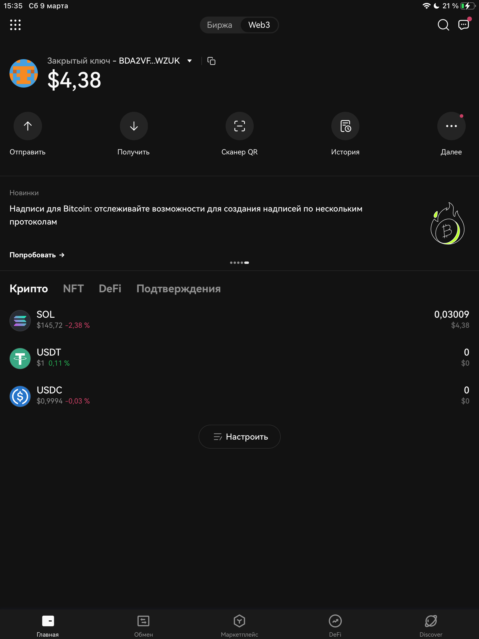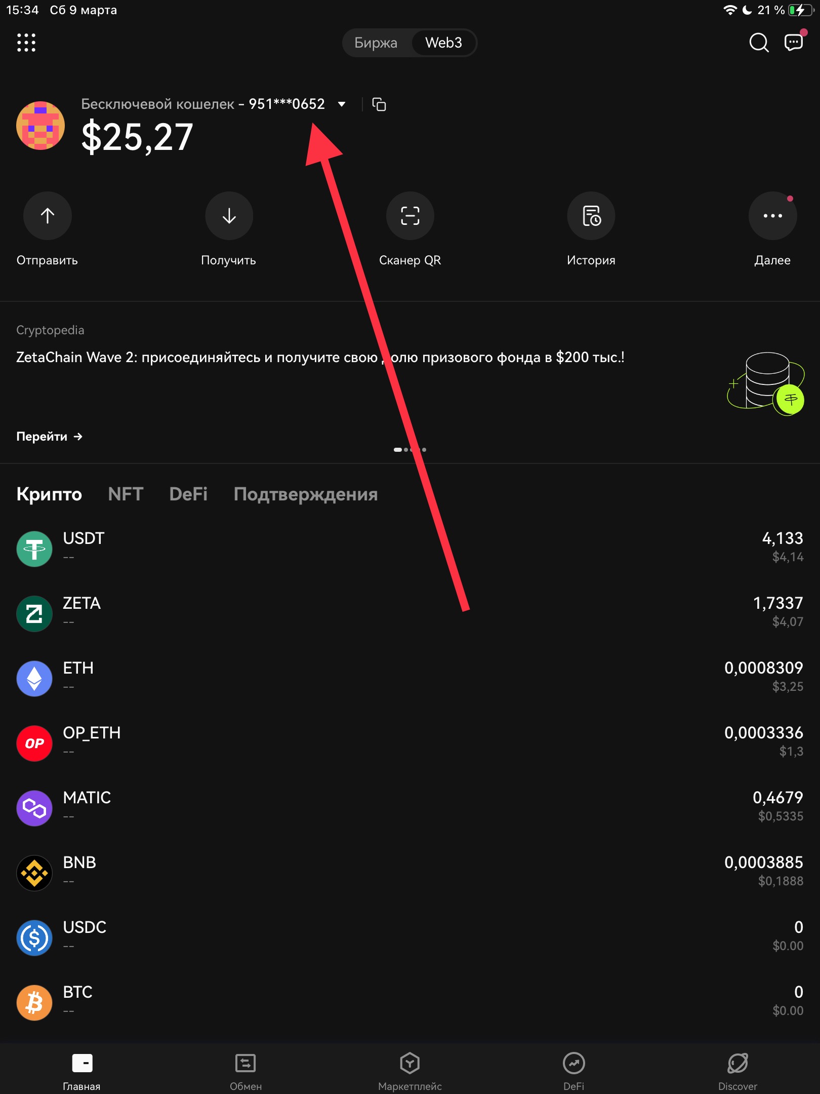 Адрес кошелька во вкладке Me