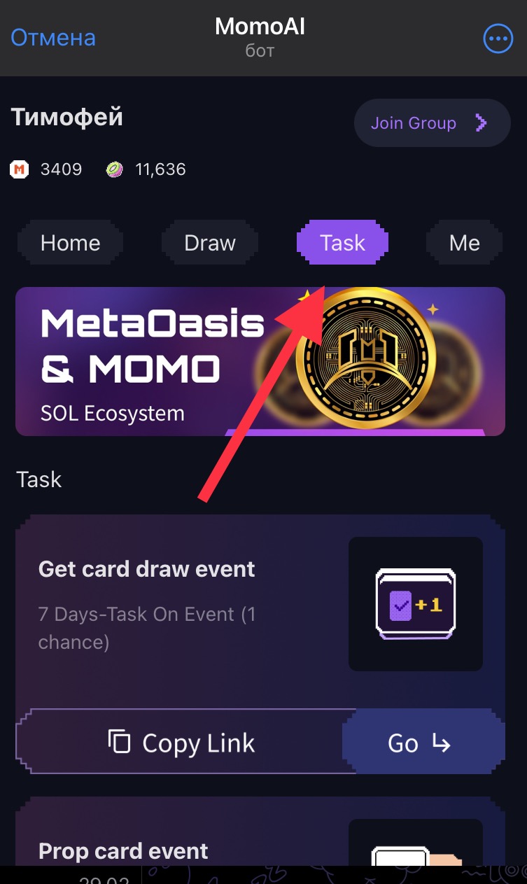 Переходим в боте во вкладку Task