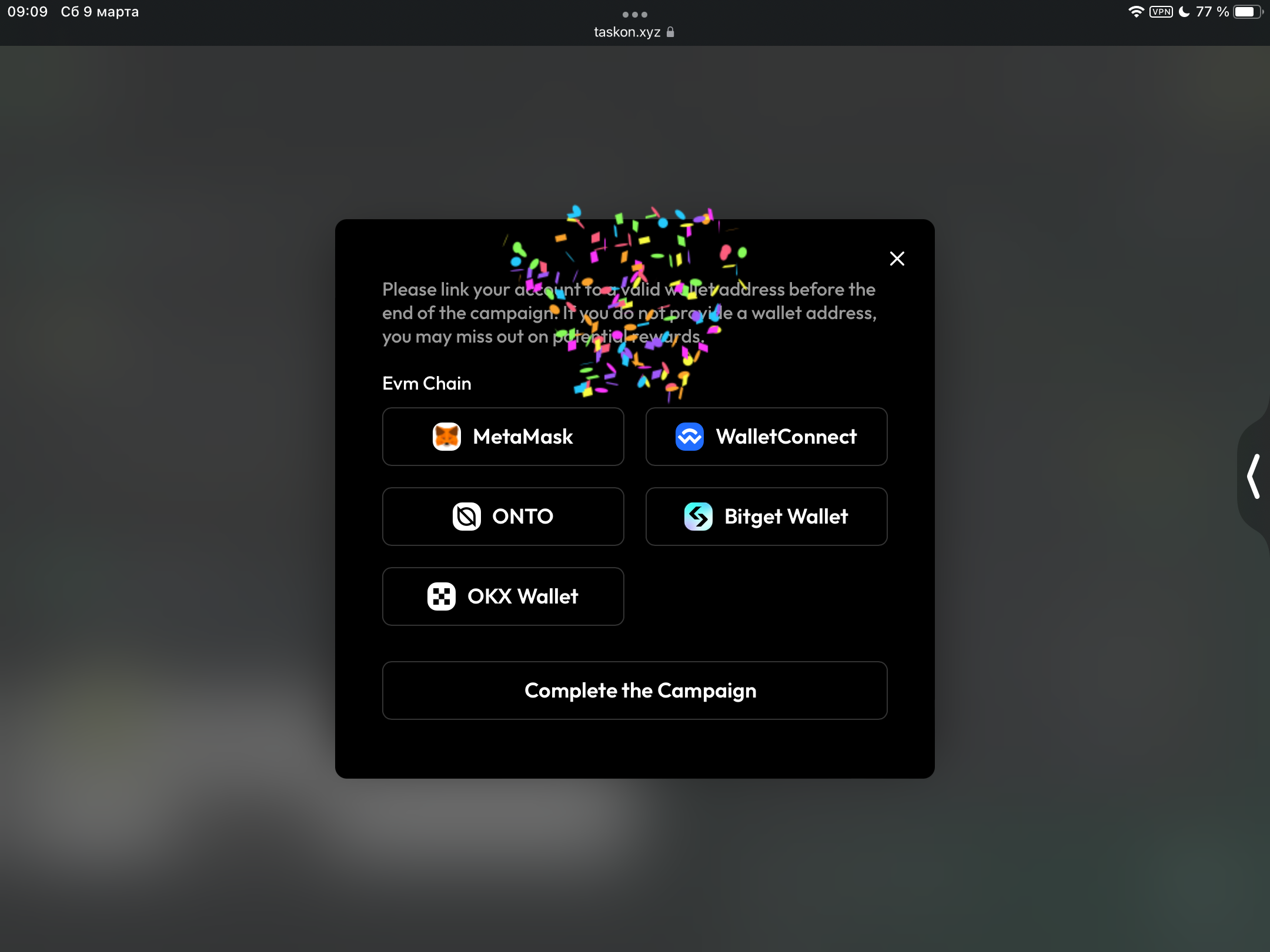 Нажимаем Complete. Попросит подключить кошелек, подключайте удобный вам