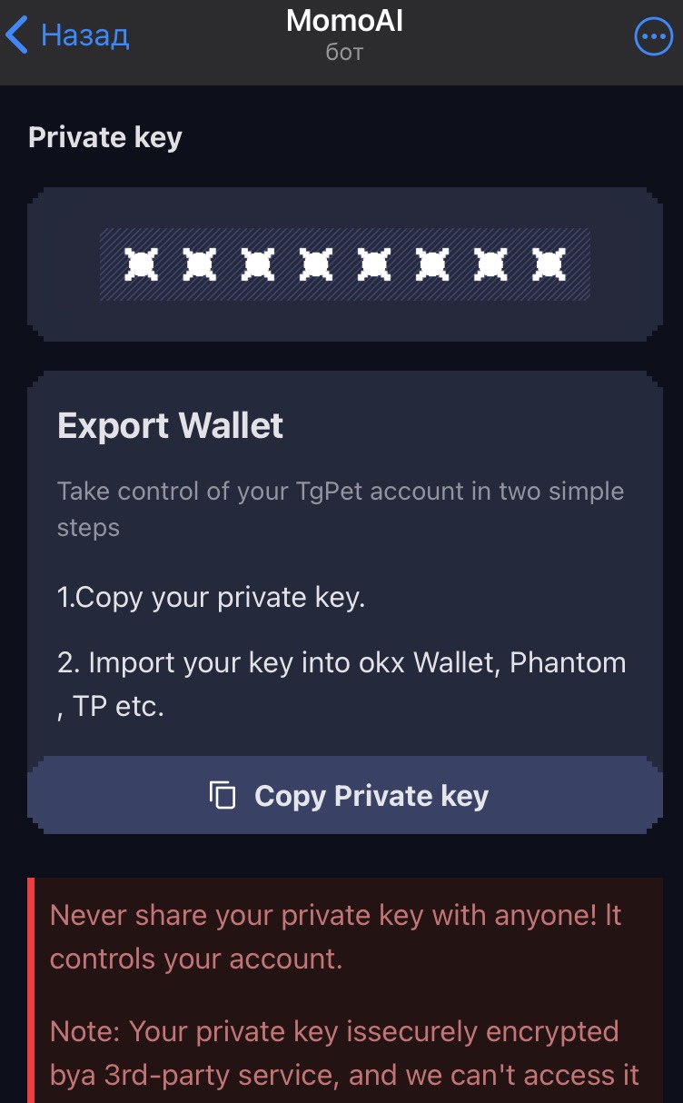 Теперь нажимаем «Copy Private key», это ваш ключ для входа в кошелек.